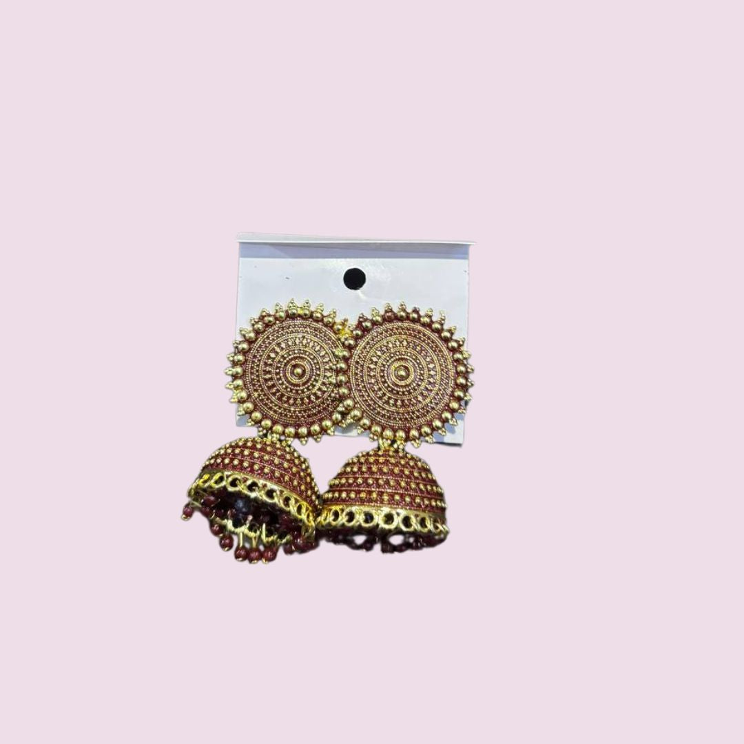 Step into regal elegance with the Rajnigandha Antique Maroon Dome Jhumka Earrings, a rich tribute to traditional Indian temple jewellery. These exquisite earrings showcase a sunburst circular stud with intricate detailing, paired with grand dome-shaped jhumkas featuring deep maroon stonework, antique golden accents, and hanging bead droplets.